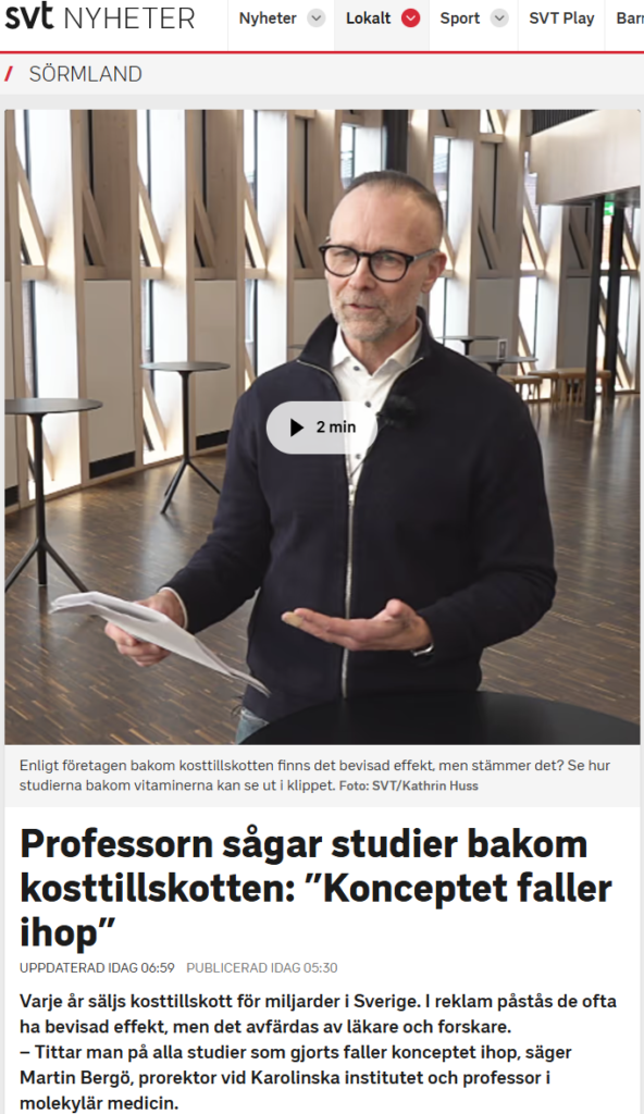 Professor Martin Bergö uttalar sig i SvT om det vetenskapliga underlag som används av företag som säljer kosttillskott. Han hävdar att företag bara använder sig av små studier som styrker deras påståenden och att dessa inte duger som vetenskapligt underlag.